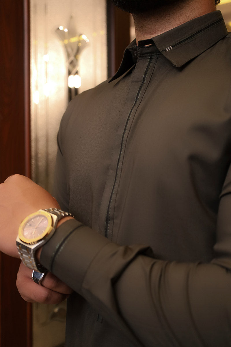 Premium fabric (Wash-n-Wear) kameez shalwar with signature stitch detail.